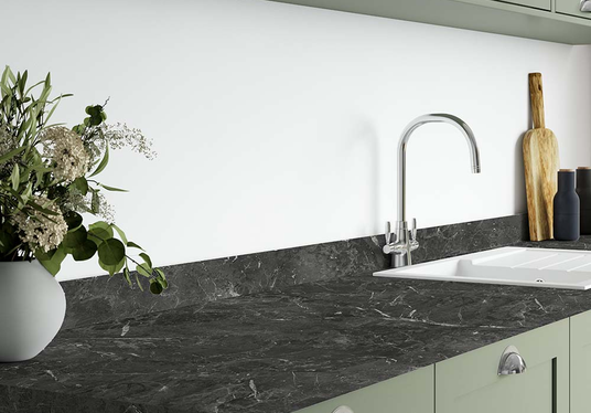 In dark grey marble with striking white veins, the Marquina Marble laminate worktop is a realistic slab effect worktop. Marquina Marble has been designed to look like marble; its Roche texture feels like natural stone too, giving the lifelike effect without the long and complex fitting process. Choose your preferred profile; available in both 38mm square edge or postformed.