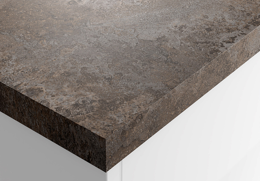 Urban Calderia is a dark concrete laminate worktop design, crafted to look like a dark grey concrete with dappled depths. The fusion texture adds to this effect, with a coarse matt surface with small gloss reflections which make the surface vibrate with oxidised reflections. Choose your preferred profile; available in both 38mm square edge or postformed.