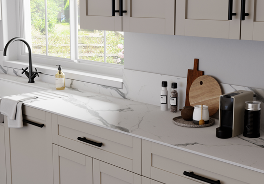 A double sided compact laminate splashback panel for completing your design. This compelling alternative to traditional tiles are durable and easy-to-installed. Continuity or contrast, whatever you fancy, you can have a pick from either the same decor and textures as worktop and breakfast bar or choose contrasting decors from an exclusive range.